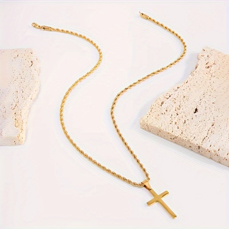 Colar com pingente de cruz em aço inoxidável banhado a ouro 8K, corrente de corda elegante, acessório de joalheria religiosa unissex