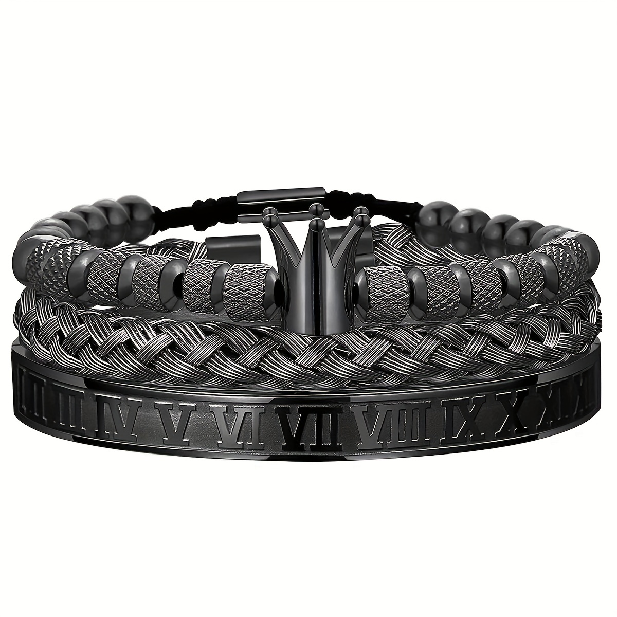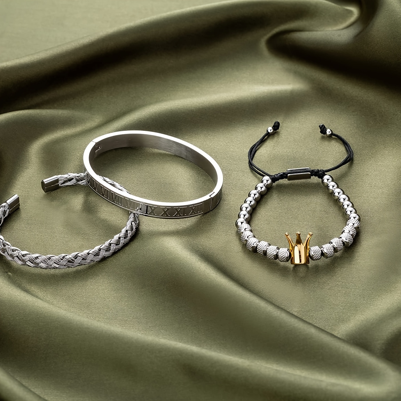 Conjunto de três peças com um estilo luxuoso e discreto: pulseira e bracelete em aço inoxidável polido com trança romana em formato de coroa, um modelo moderno e elegante.